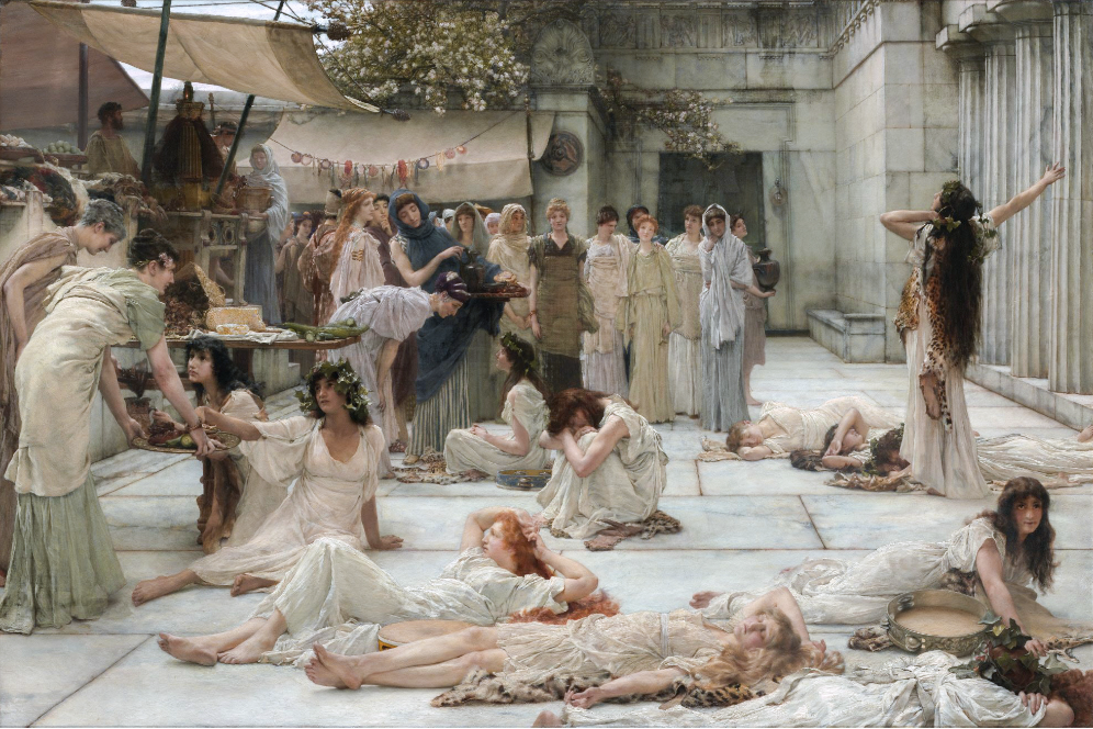 The Story Behind the Painting: Lawrence Alma-Tadema’s "The Women of Amphissa" (1887) portrays a beautiful moment of humanity amidst chaos. The painting is based on a story from Plutarch’s Moralia, where a group of women who had been celebrating the Bacchanalia, a festival for Bacchus (Dionysus), are found sleeping in the marketplace of Amphissa. After a night of wild dancing and ritual frenzy, they are vulnerable, having unknowingly wandered into a city allied with their enemies. Instead of taking advantage of this situation, the women of Amphissa step in to protect these women, offering food and care. Alma-Tadema captures the tenderness of this moment, transforming a tale of conflict into one of female solidarity and protection.